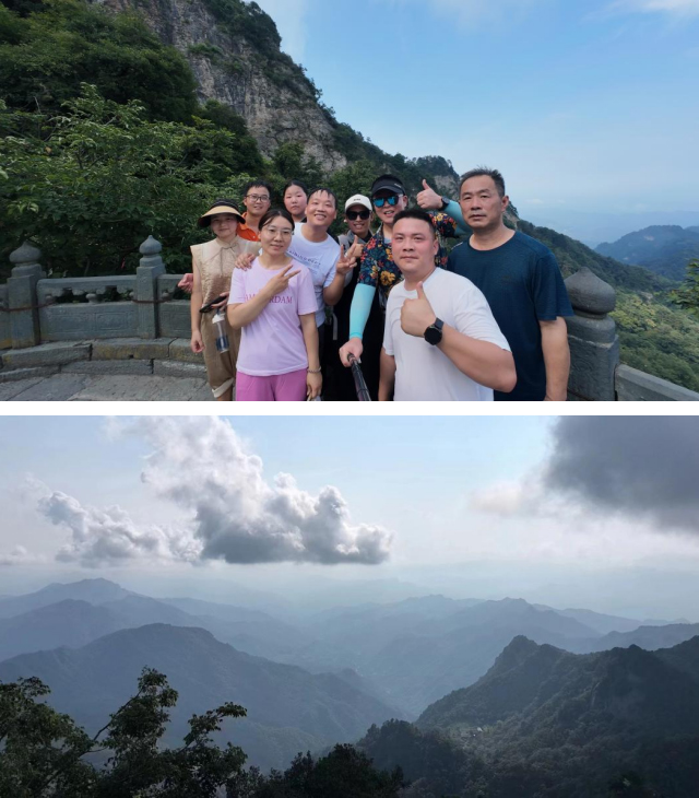 午餐后稍事休息,大家懷著興奮與期待的心情齊聚武當山南巖,向著主峰金頂前進。抬頭望去,巍峨的山峰直插云霄,仿佛在向每一個人發起挑戰。團隊成員們身著運動裝備,精神抖擻,迎接這場體力與意志力的考驗。開始時,山路較為平緩,大家輕松地走著,欣賞著周圍的美景。綠樹成蔭,鳥兒在枝頭歡快地歌唱,清新的空氣讓人心曠神怡。然而,隨著高度的不斷上升,山路變得越來越陡峭,腳步也逐漸沉重起來。但大家并沒有被困難嚇倒,一路互相鼓勵、互相扶持。研發部同事王俊柯的父母,也隨著年輕的同事們一起攀登,并一直保持在大部隊的前列,讓大家深為感動。經過3個多小時的艱難挑戰,團隊終于到達了山頂。俯瞰著腳下的美景,大家心中充滿了成就感。連綿起伏的山巒、云海翻騰的景象,讓人仿佛置身于仙境之中。此時,大家早已忘記了疲憊,盡情地享受著這勝利的喜悅。
